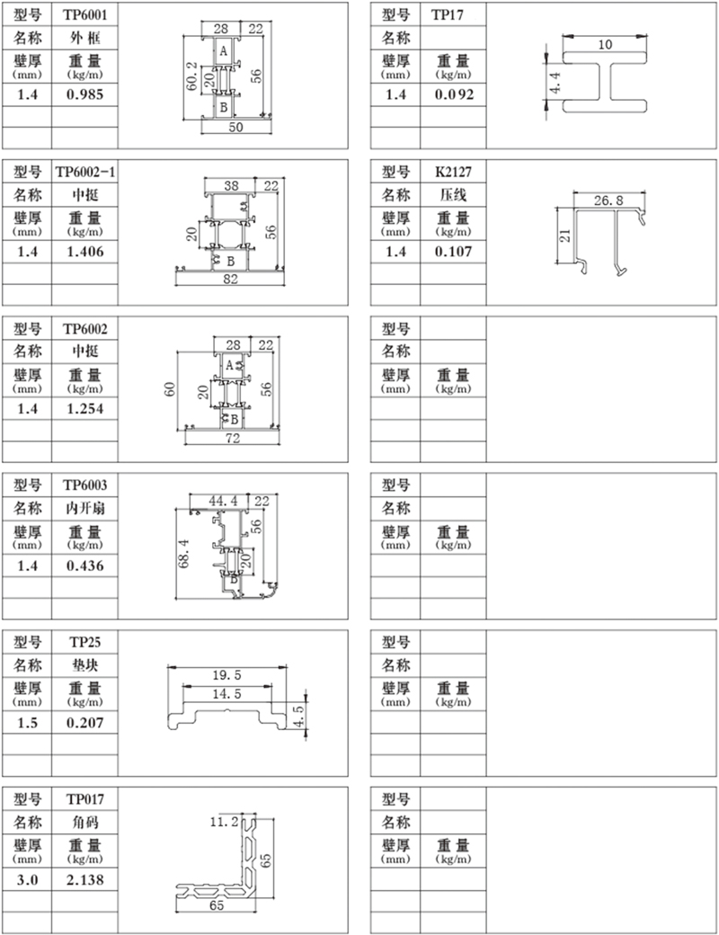 3.型材表中米重僅為型材理論重量,不包含膠條重量,因型材表面處理及包裝方式不同,會對型材的實際重量產(chǎn)生差異。(雙12mm股條膠重約0.08kg/m,雙14.8mm膠條膠重約0.1kg/m)注:圖中所示壁厚為坯科厚度,米重為理論重量,實際重量以過時的重量為準(zhǔn)!